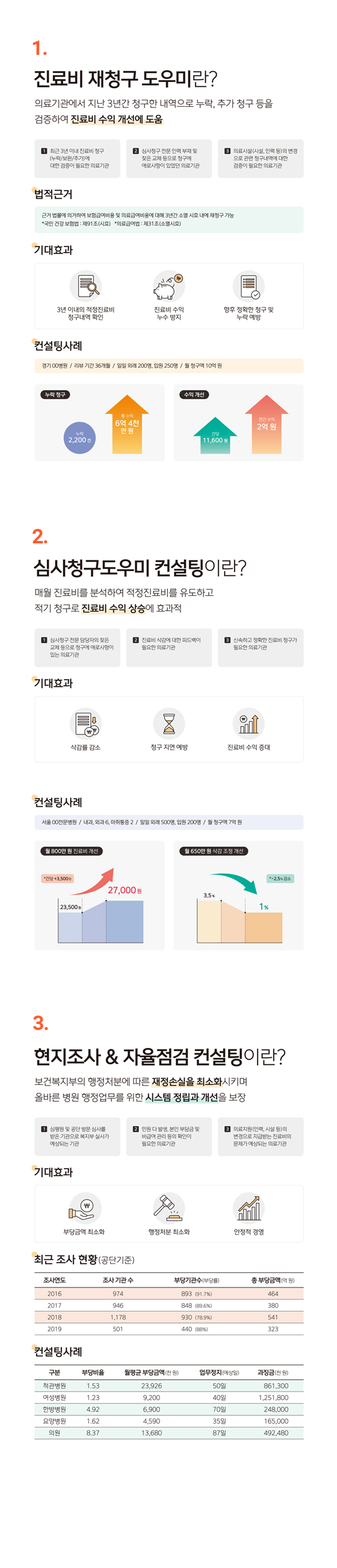 심평원 출신의 현지조사 전문가들과 2천여개 심사청구 진단 경험을 가진 심사전문가들의 노하우와 풍부한 현장경험을 바탕으로 의원의 재정손실을 최소화하고, 수익개선의 동반자가 되도록 하겠습니다.